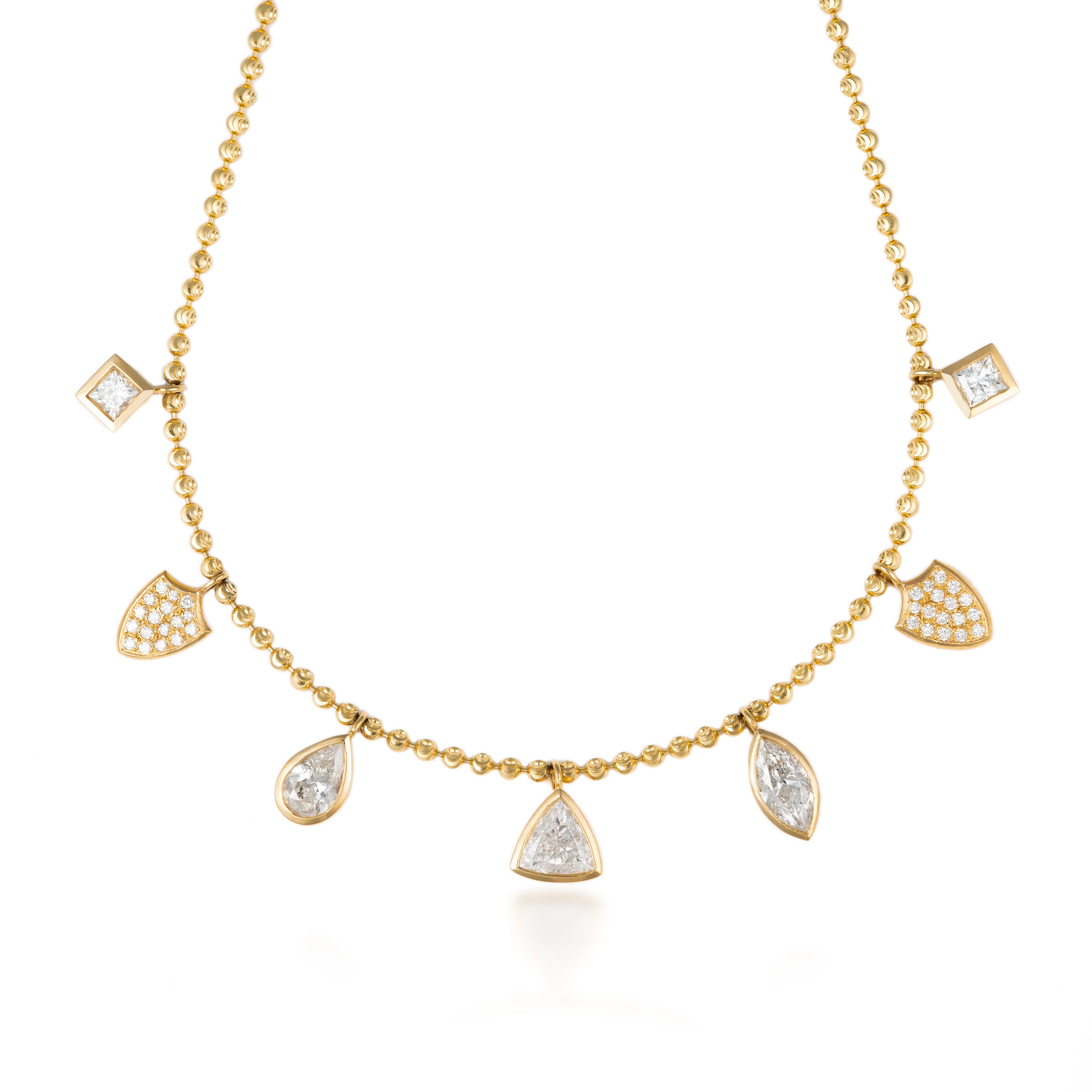 Necklace With 5 Multi Shape Diamonds Drops & 2 Pave Diamond Shields