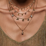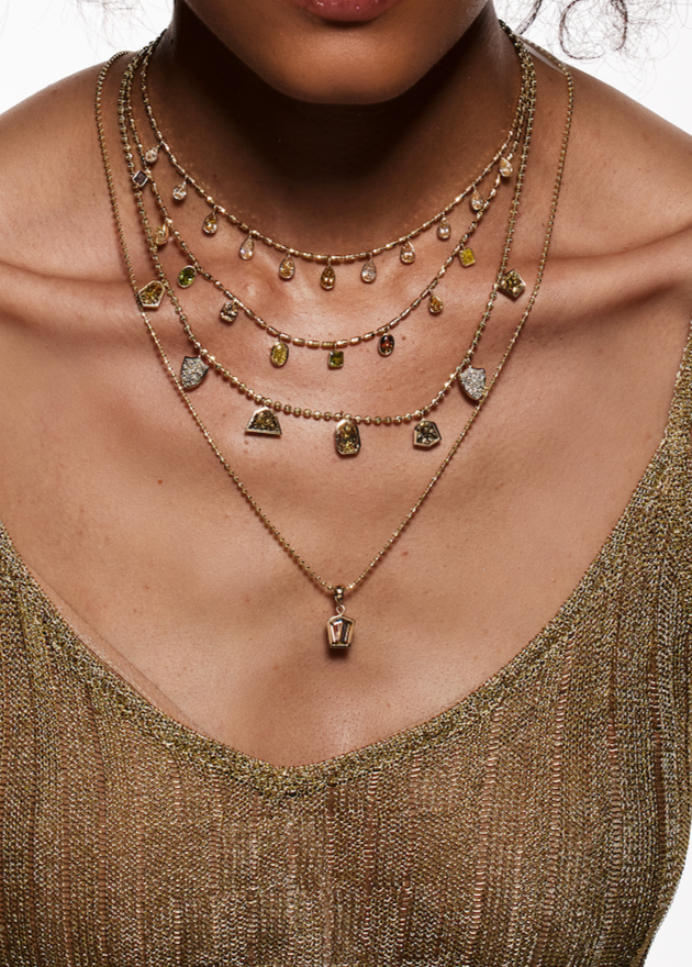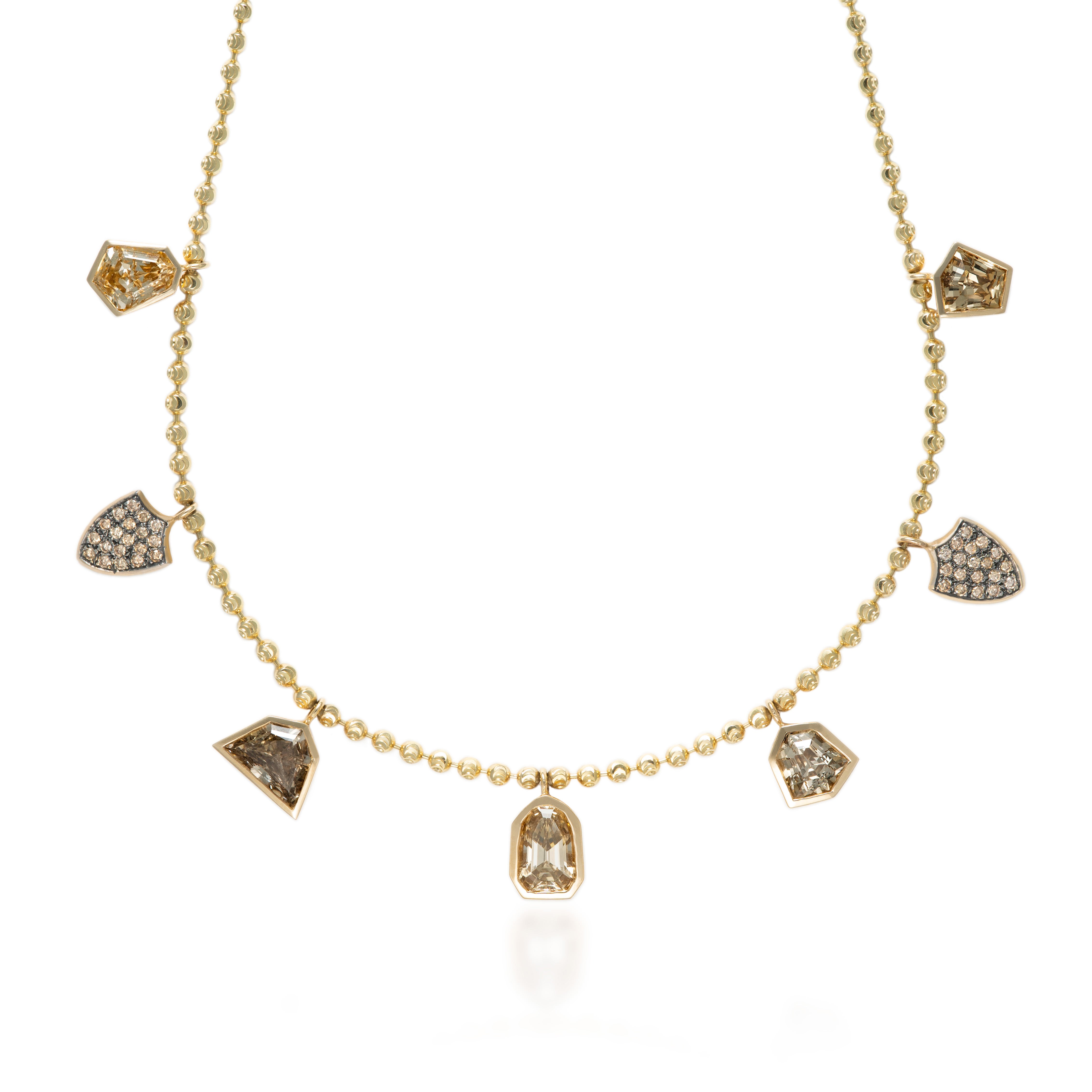 Necklace With 5 Hanging Multi Shape Diamond Drops In Various Shades Of Cognac & 2 Pave Cognac Diamond Shields.