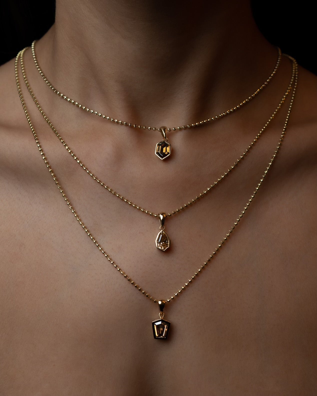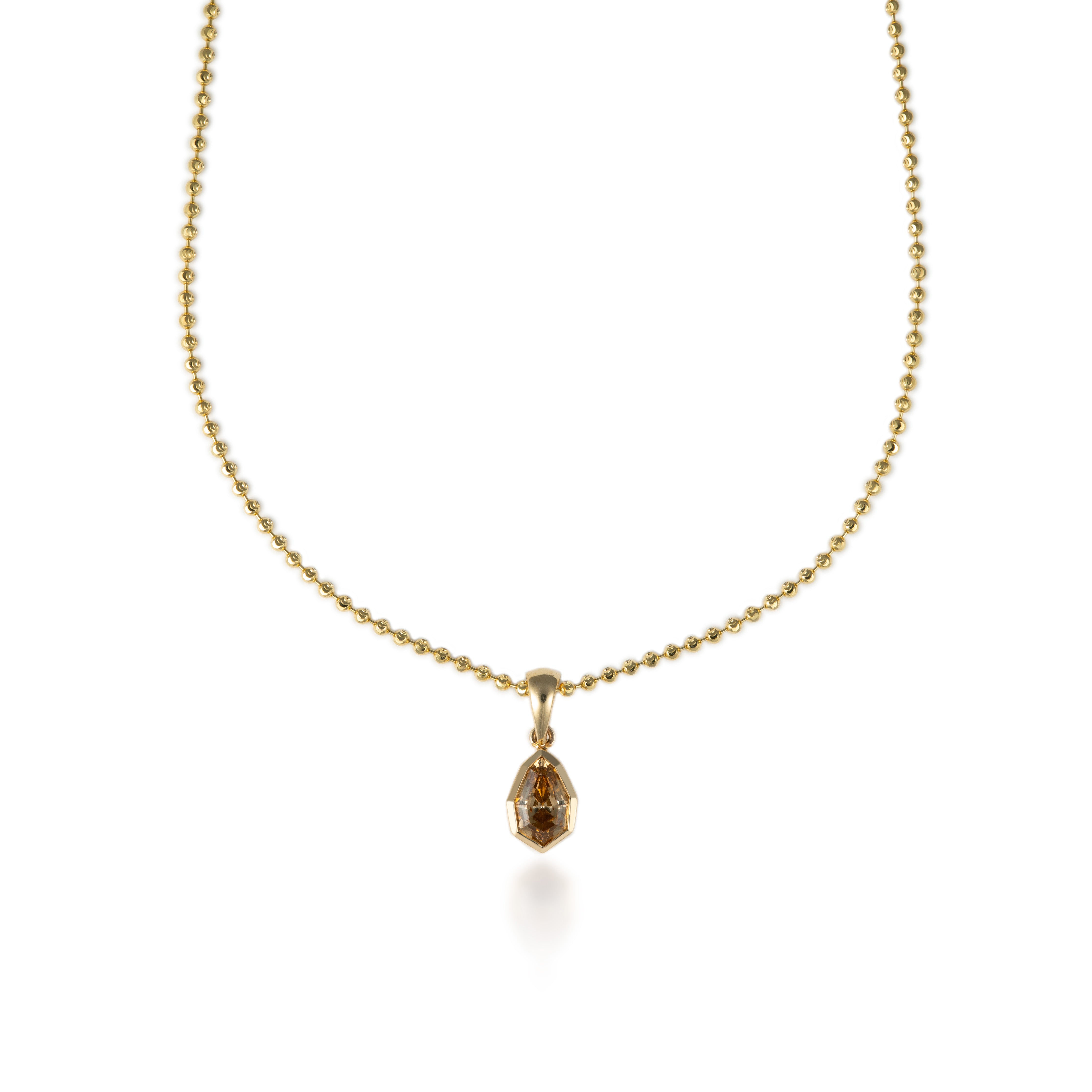 Pendant With Single Cognac Fancy Color Bullet Shield Shape Diamond In Champagne.